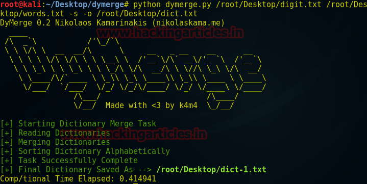 python dymerge.py /root/Desktop/digit.txt /root/Desktop/words.txt –s –o /root/Desktop/dict.txt