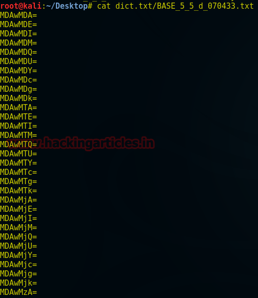 ./pydictor.py --len 5 5 -base d --encode b64 –o /root/Desktop/dict.txt
