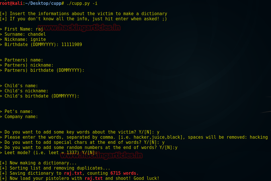 For more detail read the full article from here: https://www.hackingarticles.in/comprehensive-guide-on-cupp-a-wordlist-generating-tool/