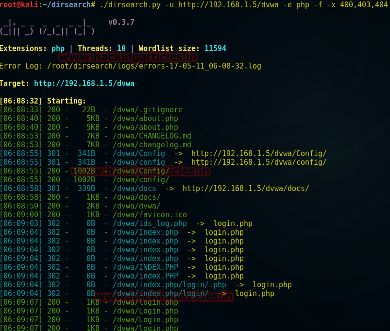 ./dirsearch.py –u http://192.18.1.5/dvwa -e php -f -x 400,403,404