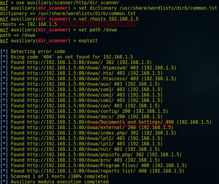 use auxiliary/scanner/http/dir_scanner msf auxiliary(dir_scanner) >set dictionary /usr/share/wordlists/dirb/common.txt msf auxiliary(dir_scanner) >set rhosts 192.168.1.5 msf auxiliary(dir_scanner) > set path /dvwa msf auxiliary(dir_scanner) >exploit