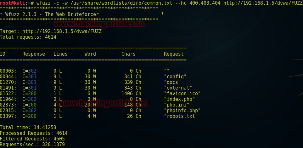 wfuzz -c -W /usr/share/wfuzz/wordlist/dir/common.txt --hc 400,404,403 http://192.168.1.5/dvwa/FUZZ