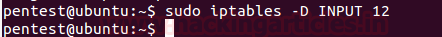 In order to delete any rule of your Iptable to remove it from inside your filter table, you can use option -D with input rule number. We are going to remove our last rule ICMP drop connection which was at number 12 in the given list of the rule.