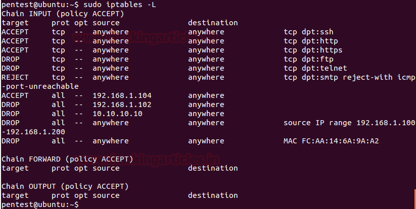 In order to view our applied chain rules once again, we are going to execute given below command which will dump the list of Iptable rules.
