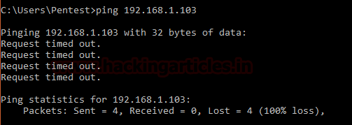 Now if someone tries to Ping the server machine as shown in given below image, so here you can read the message “Request timed out” which means the server machine has dropped our ICMP request packet.