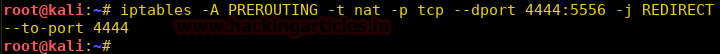 Now we define iptables to reroute all traffic coming to port 4444-5556 to port 4444. So that when the reverse shell tries to connect to our system on port 5556 it will be rerouted to port 4444.