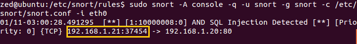 So when the network admin get alert from IDS on the basis of it he can take action against attacking IP. As shown in given image the malicious traffic is coming form 192.168.1.21 on port 80.