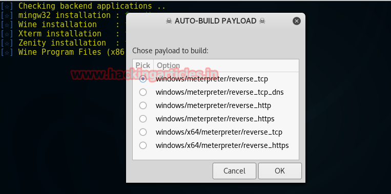 Select payload to build as I had chosen window/meterpreter/reverse_tcp for the attack.