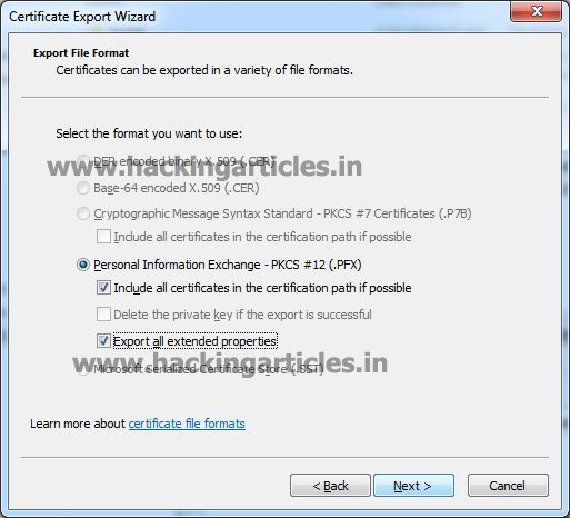 Now Select “Include all certificates” and “Export all extended properties”. Click next.