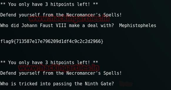 And we get the next flag and yet another question “Who is tricked into passing the Ninth Gate?” Google comes in handy again and tells us the answer once more. The next answer is Hedge.