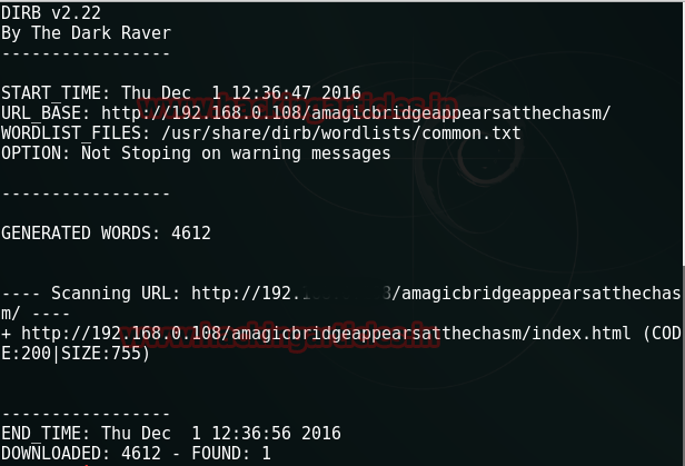 dirb http://192.168.0.110/amagicbridgeappearsatthechasm -w /root/Desktop/magicitems.txt