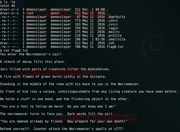 We type in ls -la and yes it’s there “.smallvile” about which we just discovered in the description alongwith our 10th flag. Let’s open it using cat.