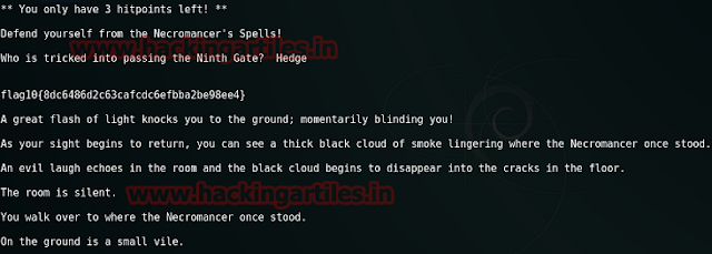 Ok. We have our 1st flag. And a message to chant the flag’s string at UDP port 666. The flag1 text seems to be a md5 hash so we decrypt it at www.hashkiller.co.uk . It decrypts to “opensesame”. Let’s return to our port 666 using netcat and type in this string there.
