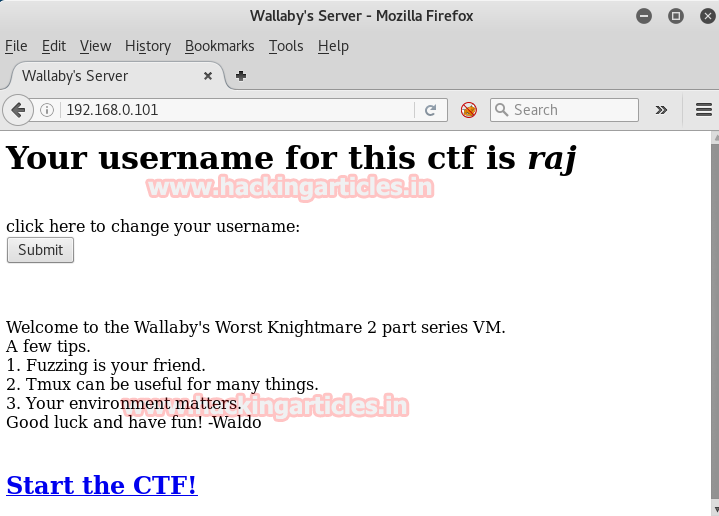 When I clicked on submit tab is linked to next web page where you can read the assigned username for this CTF from screenshot now we can start this CTF when we will click on given link start the CTF!