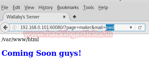 Again I browse above highlighted text 192.168.0.101:60080/?mailer&mail=pwd in URL and the web page comes outside with /var/www/html