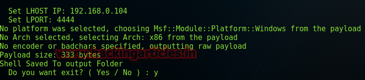 Now enter the LHOST IP i.e. your system IP and LPORT i.e. the port you want the reverse connection on your i.e. attacker system. In my case the LHOST is 192.168.0.104 and LPORT is 4444.