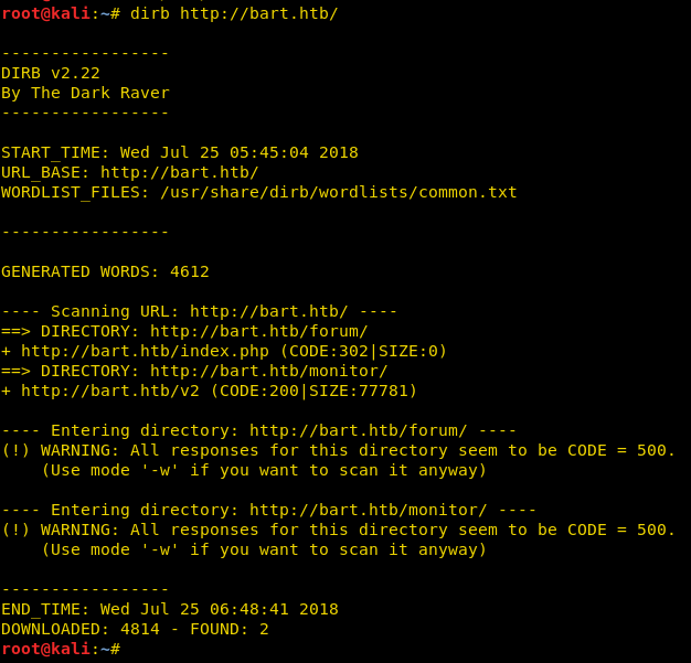 When we open bart.htb it redirects us to forum.bart.htb. We enumerate directories for both domains and find a directory called “/monitor” for domain bart.htb.