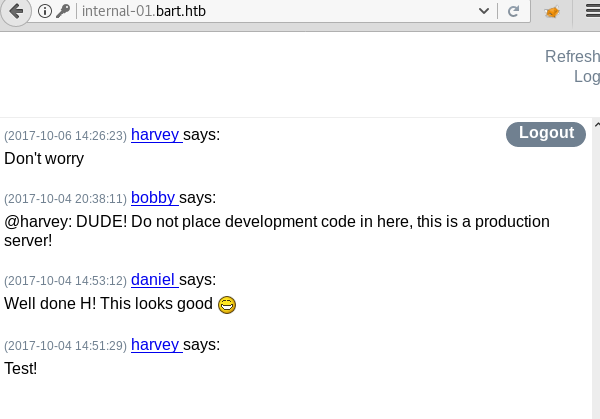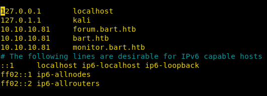 Since htb doesn’t have global DNS, we aren’t going to be able to resolve the site. So we add a DNS entry in our /etc/hosts file to point 10.10.10.81 to both bart.htb and forum.bart.htb.
