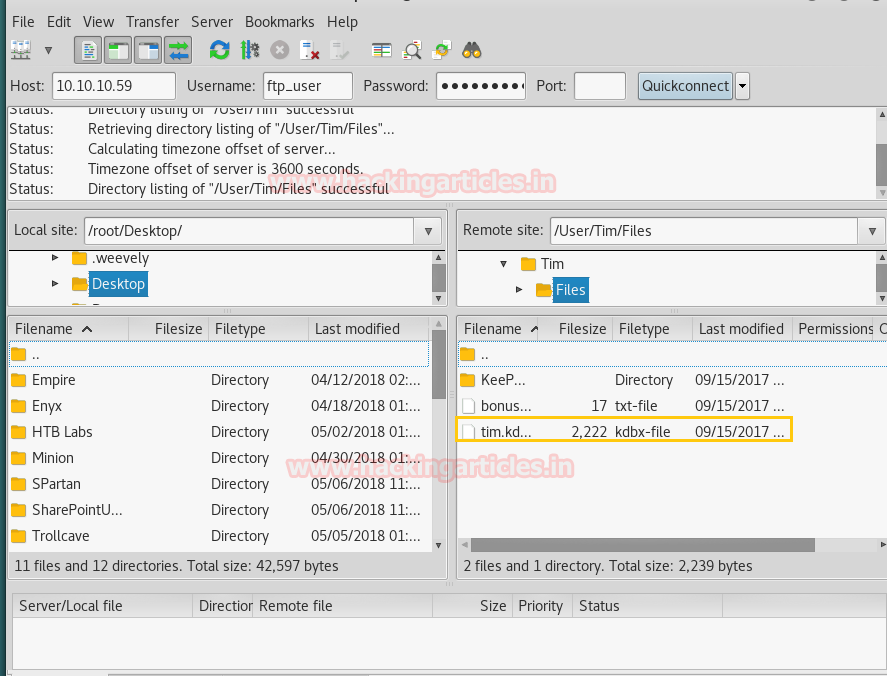 Now login into FTP using following credentials and download tim.kdbx in your local machine.