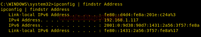 As the output of the ipconfig command is very vast so we will use the findstr command to filter out the specific result about the address.