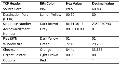 From image given below, you can observe Hexadecimal information of TCP header field. Using the given table you can study these value to obtain their original value.