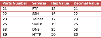Using given below table you can read Hex value of other Port Number and their Protocol services. Although these services operate after getting acknowledgment from the destination network and explore at application layer OSI model.