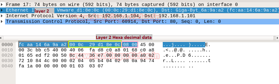 In Wireshark Ethernet II layer represent the information transmitted over the data link layer. From given below image you can observe that highlighted lower part of Wireshark is showing information in Hexadecimal format where the first row holds information of Ethernet headers details.