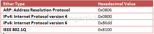 The data link layer holds 6 bytes of the sender’s system and receiver’s system Mac address, and 2 bytes of Ether type indicate which protocol is encapsulated, i.e., IPv4/IPv6 or ARP.