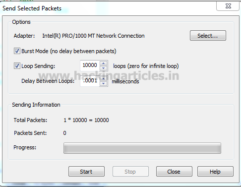 Click on Send option from the menu bar and enable the checkbox for “Burst Mode” and “Loop sending” and adjust the number of packets to be sent to the Destination network according to your wish.