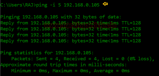 Similarly, we can also set TTL (Time to Live) for echo request packets; by default, the source machine sends 4 packets of request queries at the rate of 1 millisecond per packet. Suppose we want to give TTL between two packets; we set -i as 5ms so that after we deliver the first packet, we send the second packet after 5ms.