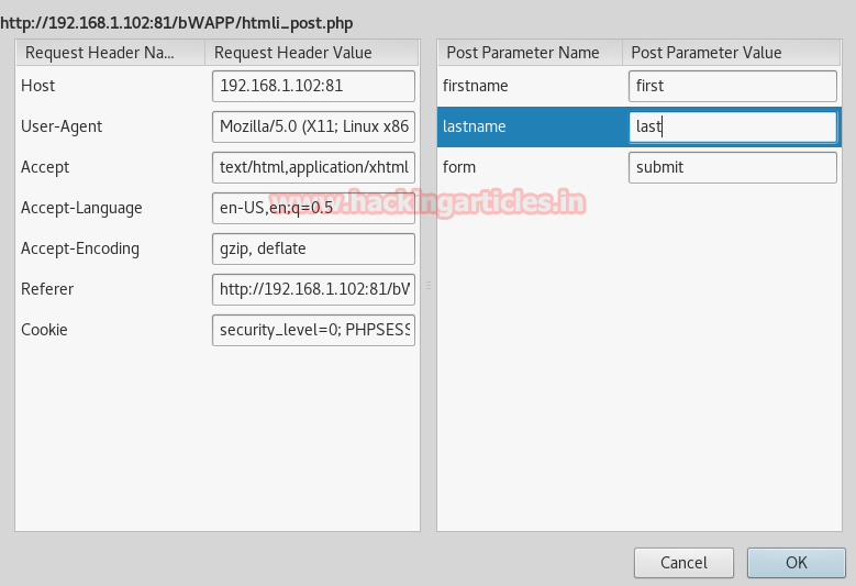 Tamper data allow you to modify the sent request of any user without his permission, so I am going to change first and the last name given by user into first as the first name and last as the last name and then click on ok to forward the request.