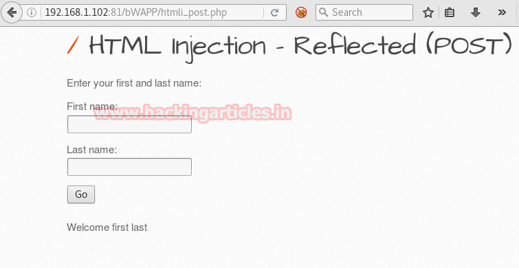 Login into web application server by typing bee: bug as login credential, now choose your bug” html injection-reflected (post)” from the given list of bugs and click on the hack.