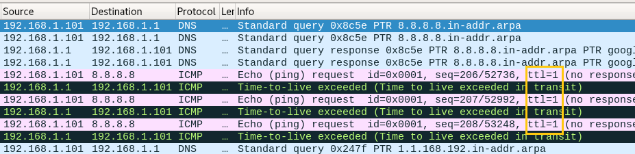 - The packet first goes from source 192.168.1.101 to first router 192.168.1.1 having ICMP echo request packet with TTL=1
