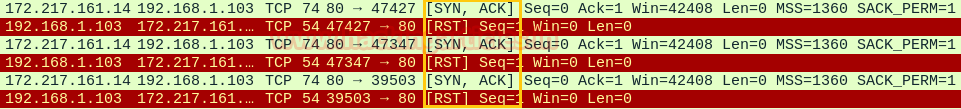 Here we can observe ACK-SYN packet from the destination (172.168.161.14) is sent to source (192.1681.103) from port 80 and source again sent RST packet to the destination via port 80.