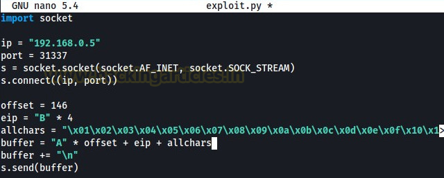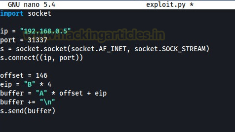 Next, we will update our exploit code accordingly. As we now know the EIP offset value, we don’t need to send the pattern anymore. We can simply send 146 A’s in place of the pattern. We will send 4 B’s after 146 A’s as to ensure whether we can control the EIP or not. If the EIP register has 4 B’s after the execution of the exploit, then it will be confirmed that we can control the EIP now.