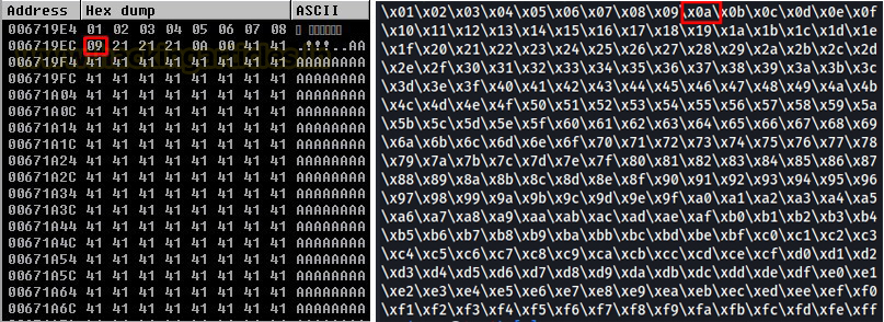 Now, if we compare the hex dump with all characters that we sent then we will see that everything is going pretty fine from 01 to 09 but after 09, 21 is there instead of 0A. This means that “\x0a” is a bad character.