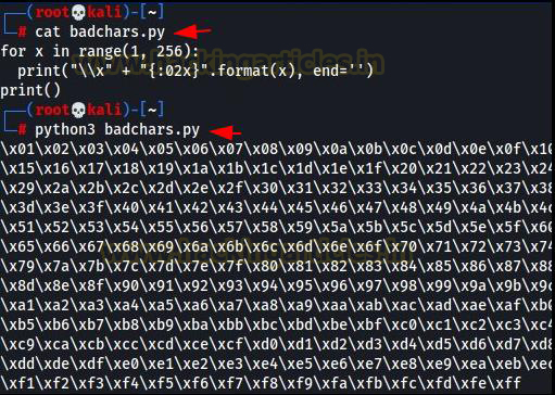 To find the bad characters we will first generate all characters with a python script and send it to the application to crash and analyze it. The code present below generates all characters from x01 to xff without x00 as x00 is a bad character by default. x00 is known as the null byte.