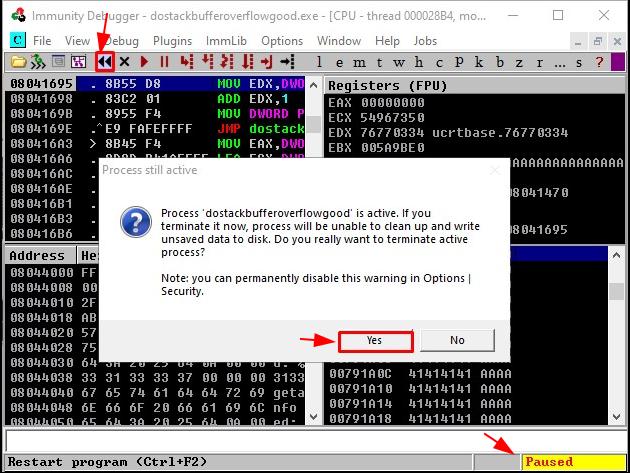 Every time the application crashes, we will have to make sure that we have restarted the application before we crash it again for testing. To do so we will press the rewind button in Immunity Debugger’s control execution panel and then select “Yes” in the next dialogue box.