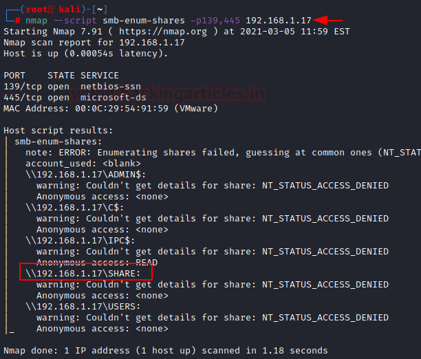 nmap --script smb-enum-shares -p139,445 192.168.1.17