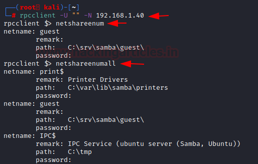 rpcclient -U "" -N 192.168.1.40 netshareenum netshareenumall