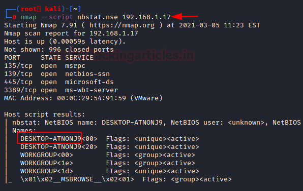 This nmap script attempts to retrieve the target’s NetBIOS names and MAC address. By default, the script displays the name of the computer and the logged-in user; if the verbosity is turned up, it displays all names the system thinks it owns. It also shows the flags that we studied in nmblookup tool.