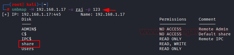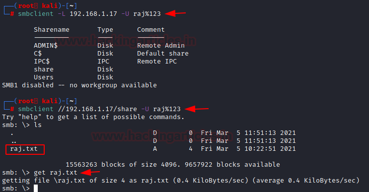 smbclient -L 192.168.1.17 -U raj%123 smbclient //192.168.1.17/share -U raj%123 get raj.txt