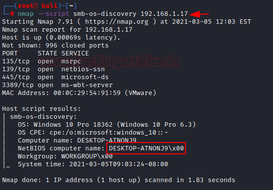 Firstly, we will start the enumeration of the SMB by finding the hostname of the target machine. This can be done by various tools.